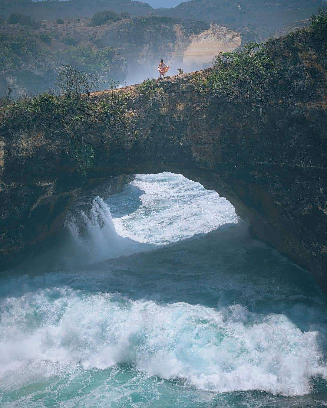 Broken beach or commonly known as pasih uug, the word uug means broken in Balinese. This very famous beach is located in Banjar Sumpang, Bunga Mekar Village, Nusa Penida District, Klungkung Regency, Bali Province. The uniqueness of this is the existence of a hole in the middle of the 200 meter coastal cliff. This beach is very beautiful thanks to the very high cliffs.